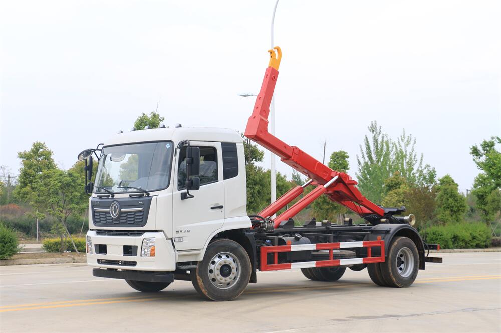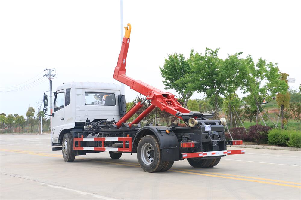 該款鉤臂式垃圾車由液壓系統、操作系統組成。舉升油制缸(1支)系國內知名液壓件廠家生產的雙作用油缸。垃圾廂可自吊上放下,可自行傾倒垃圾,上下一次工作循環時間≤50S。該車的特點是一個車能配多個垃圾廂,能實現一臺車與多個垃圾廂聯合作業,循環運輸,充分提高了車輛的運輸能力。