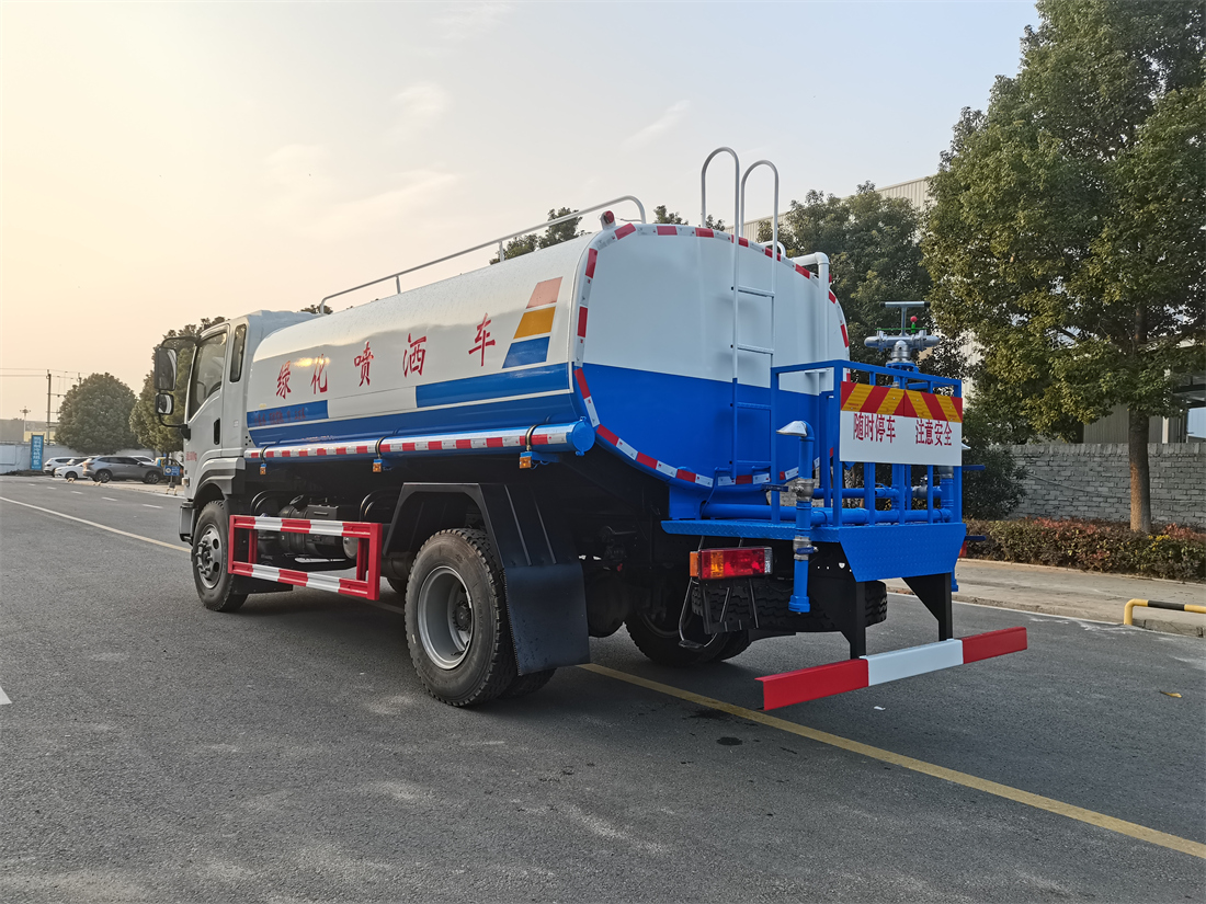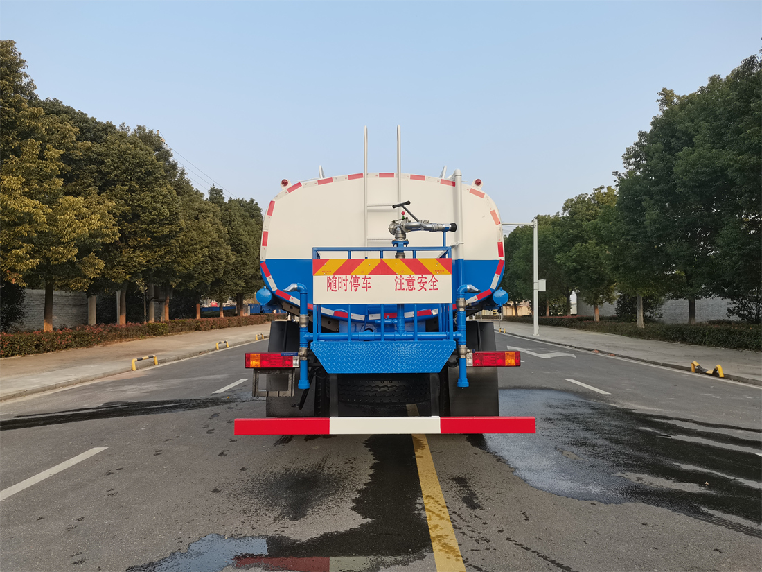 灑水車前裝有鴨形噴嘴或圓頭沖嘴,后面裝有圓柱開灑水噴嘴或蓮蓬頭噴嘴,后部有一工作平臺(tái),裝配有水炮。后部還可裝8個(gè)噴嘴(選裝)。