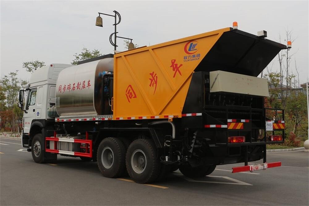 4、后雙橋同步碎石封層車完全采用電氣**,自動化程度高,,能**的計算出設備在施工過程中瀝青噴灑量和石屑撒布量的多少;